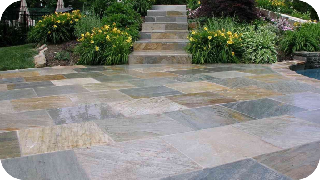 - Paving Areas: Quartzite and granite are excellent for sustainable paving in patios, courtyards, and driveways. Their strength ensures a long service life, reducing waste. Both stones offer colour variations to suit different architectural styles.